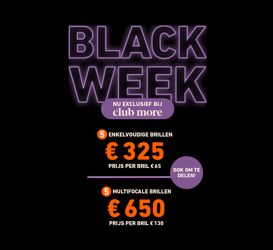 * Exclusief voor club more leden en alleen geldig tot en met 16-11-2025. eyes + more behoudt zich het recht voor deze aanbieding na 16-11-2025 te verlengen. De vermelde prijzen zijn geldig bij aankoop van vijf brillen op sterkte door maximaal vijf personen. Niet geldig in combinatie met andere acties of kortingsbonnen. De actie is uitsluitend geldig in onze fysieke stores en niet in onze webshop. De uiteindelijke prijs kan variëren bij aankoop van DRIIVE- en THE BRANDS-brillen en Premium+ glazen, en bij het afsluiten van een brilverzekering.