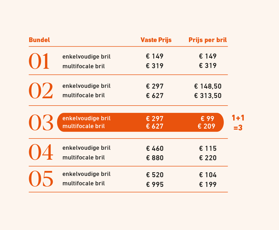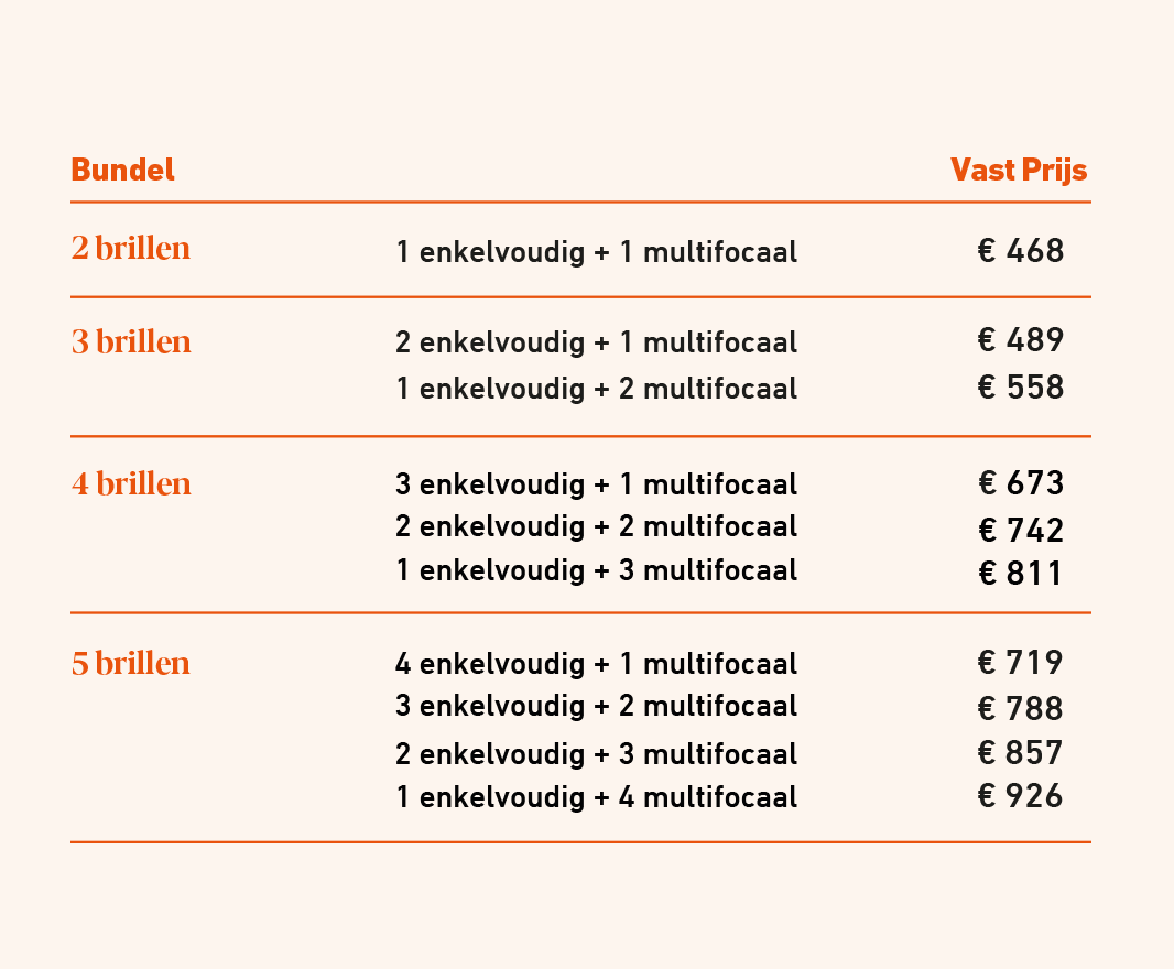 Een enkelvoudige bril heb je bij ons vanaf € 149, een multifocale bril vanaf € 319. Neem je een bundel met meerdere enkelvoudige of multifocale brillen? Dan betaal je per bril nog minder!
